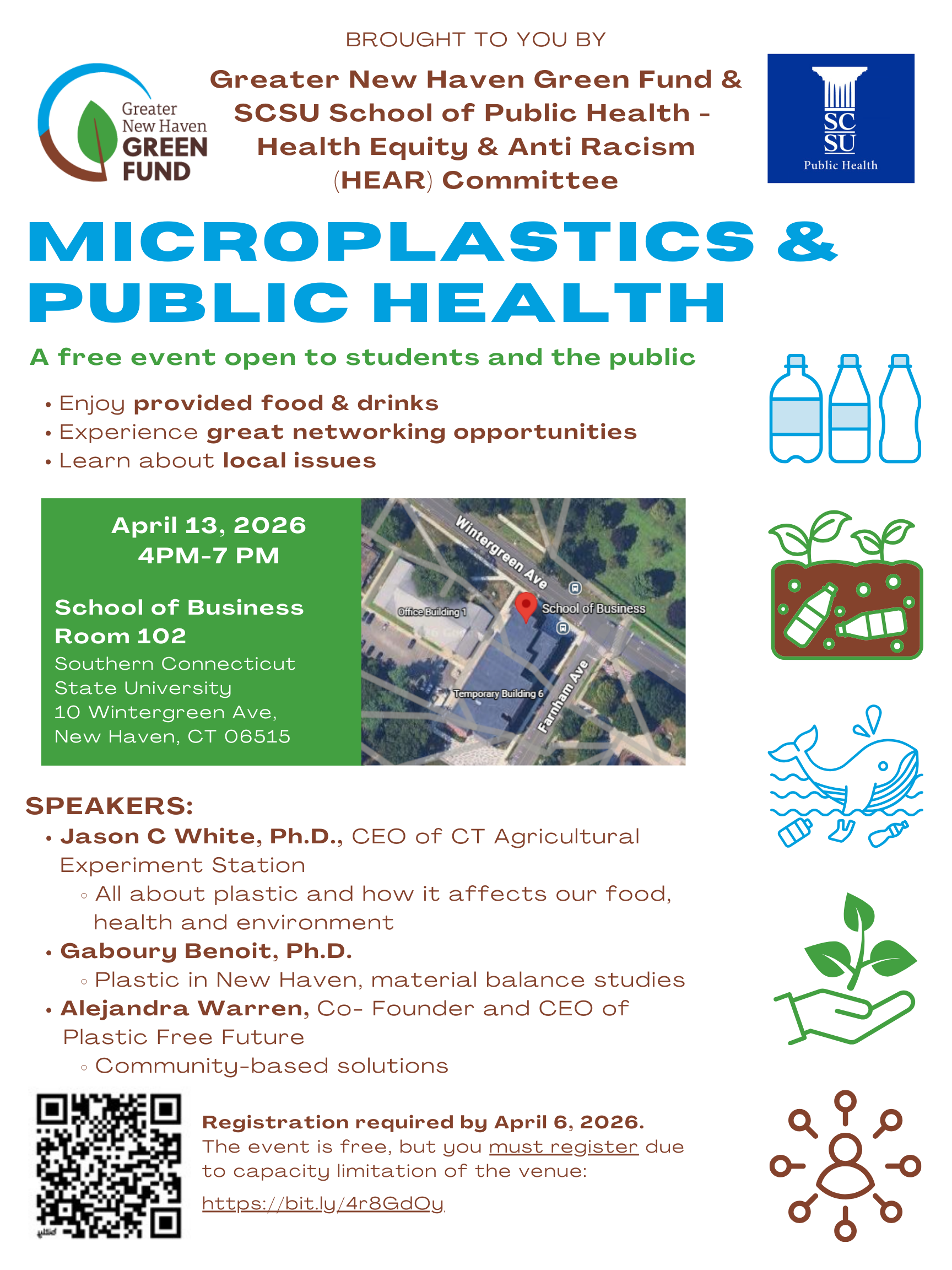 In February 2025, I used Canva to design a flyer for the nonprofit Greater New Haven Green Fund (GNHGF) and the Southern Connecticut School of Public Health - Health Equity & Anti-Racism (HEAR) Committee. Created to advertise a Microplastics & Public Health event on social media platforms, including Facebook and Instagram, this flyer remains consistent with the branding of both organizations involved while communicating to a wide audience.